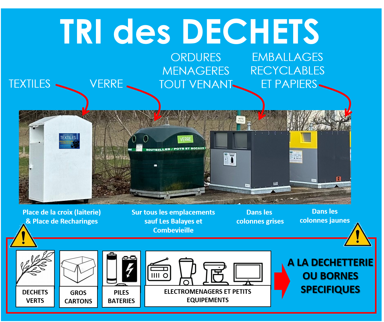 Les nouvelles colonnes sont désormais installées sur l'ensemble de la commune. Veuillez trouver ici une illustration pour bien vous repérer : - les ordures ménagères sont dans les colonnes grises - les emballages recyclables et les papiers dans les colonnes jaunes Conscients que ce changement impacte nos habitudes, nous vous remercions pour votre compréhension et votre civisme. Trouver tous les emplacements et les informations complémentaires : https://www.cc-des-sucs.fr/articles/gestion-des-dechets